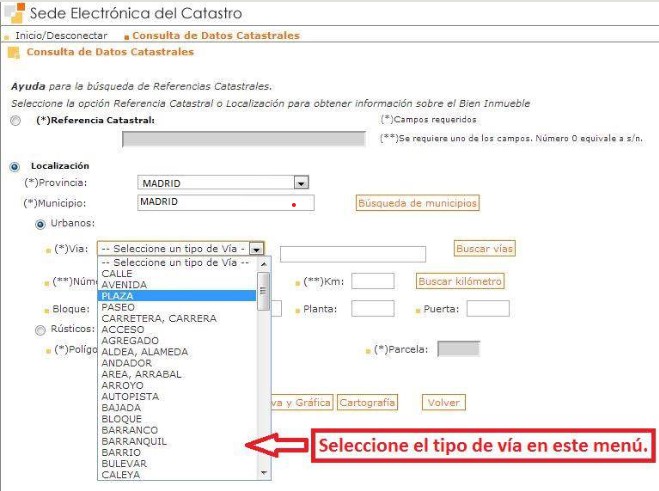 Cuarto. Seleccione el tipo de vía. En este paso, pueden surgir diferencias entre la dirección oficial y la catastral. Por ejemplo, puede que Catastro reconozca su calle como avenida, o su barriada como grupo. Eso lo explicaremos dos pasos más adelante.