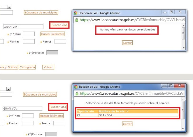 Sexto. Compruebe que la dirección está bien escrita y que Catastro la reconoce haciendo clic en el botón «Buscar vías» y le aparecerá la ventana que ve para elegir la dirección correcta. En caso de que no aparezca su dirección, pruebe cambiando la vía como hemos dicho antes o introduciendo parte del nombre, como por ejemplo en lugar de escribir «Marqués de Paradas», escriba «Paradas», ya que en algunas direcciones catastrales se corta el nombre de la calle. Vea cómo influye en este caso escribir la dirección con tilde.