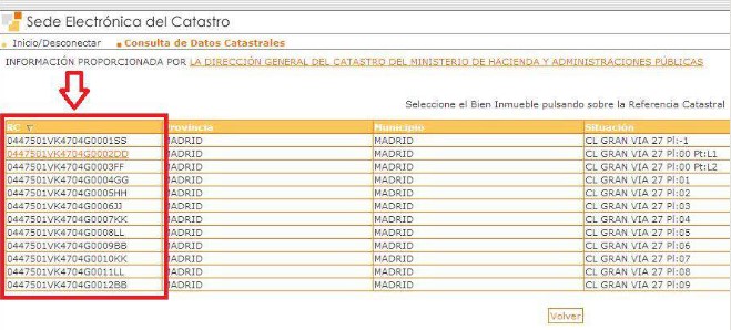 Octavo. A continuación, si su edificio es un bloque con más de una vivienda o local, verá un listado como el que mostramos a continuación. Haga clic en cualquier fila de la columna que señalamos. Por otro lado, si su edificio es una vivienda unifamiliar, pase al siguiente paso.